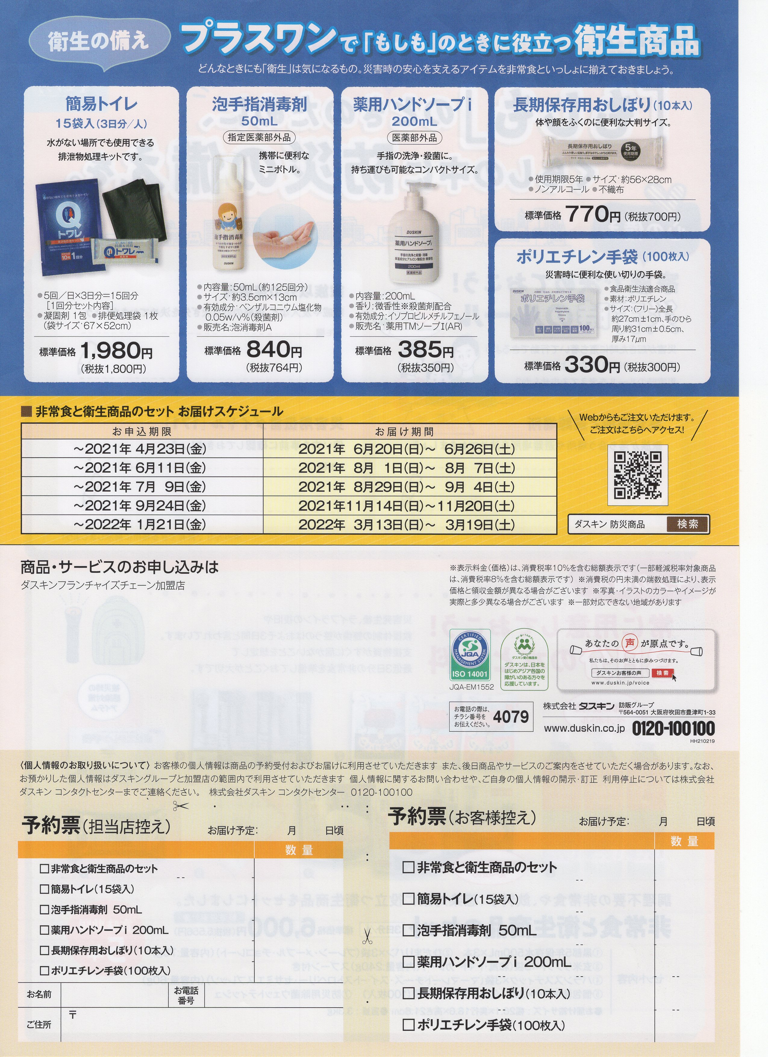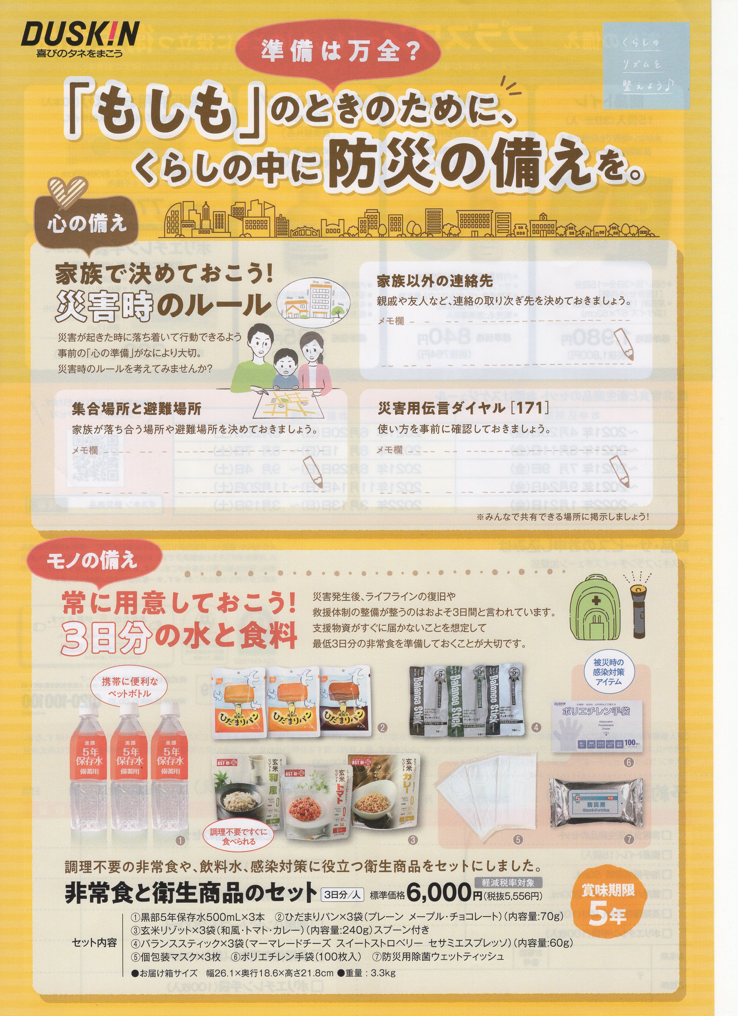 9月1日は防災の日ですが、もしもの時のための備えとして、ダスキンでは非常食と衛生商品のセット(3日分/人)の予約販売を行っております。内容は、玄米リゾット240g×3袋、バランススティック60g×3袋、ひだまりパン70g×3袋、黒部5年保存水500ml×3本、個包装マスク3枚、ポリエチレン手袋100枚、除菌ウェットティッシュで、税込6,000円です。