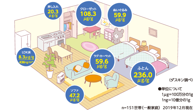 ダスキン開発研究所では、一般家庭のダニアレルゲン(Der 1)曝露量※を把握するために、小児喘息患児のいる家庭を含む一般家庭151世帯を訪問し、ハウスダストを採取してサンプルを分析、屋内のDer 1量を測定しました。以下にご紹介するのは、全151世帯で採取したサンプルのうち、最も高い値をピックアップし、示しています。