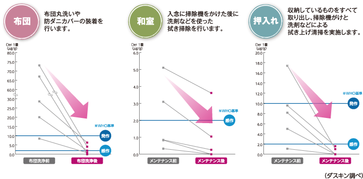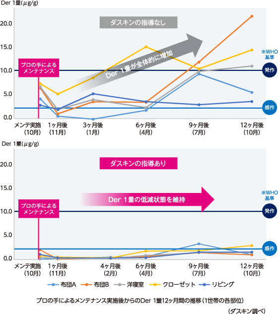 継続的な環境整備を始める前に、ダスキンによる「プロのお掃除」を実施し、徹底的にハウスダストを除去することで、Der 1量が減少しました。