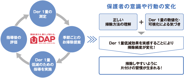 DAPの特徴は、家庭内のハウスダスト・Der 1量や掃除行動について「実態把握」・「改善」・「維持」のためのメニューを用いて、環境改善をサポートすることです。