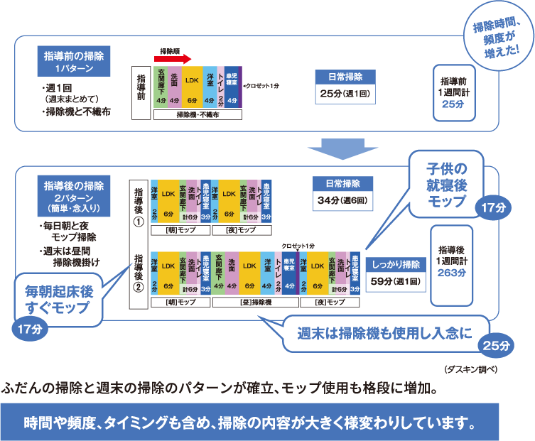 調査対象世帯(16世帯・8世帯)に対して、1週間の平均掃除時間とその内訳を尋ねたところ、以下のとおり掃除時間が大幅に増大しています(数値は調査世帯の平均)。