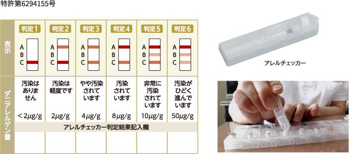 Der 1量を測定部位ごとに検出できるアレルチェッカー(特許登録済)を開発、わずか15分でDer 1量が判定でき、測定部位に応じた対策を講じることを可能にしました。