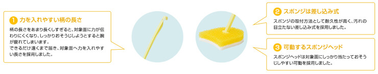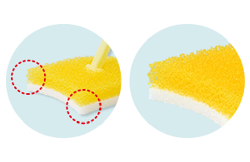 スポンジの左右の突起でカドやスミがおそうじしやすく、マイクロブラシが床や扉の凸凹面の汚れをしっかりかき出します。泡立ち、泡持ち、耐久性が良く、機能性に優れた構造です。