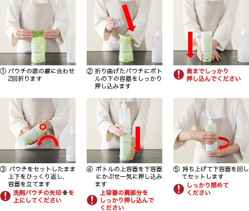 パウチごと”楽インパックボトル・ミニ”にセットして上容器をかぶせるだけで詰め替え完了です。 パウチが真空になるので、洗剤が最後まで使い切れて、しかも衛生的です。