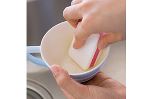 高密度メラミンフォームで、洗剤を使わなくても手アカ、水アカが簡単に落とせます。 白い食器の黄ばみや湯のみについた茶渋も、水に濡らして軽くこするだけでOK。