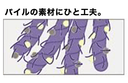 1.綿とナイロンの混紡パイルで、パイル側面から出たナイロンスパン糸(短いナイロン繊維)にホコリがからみつき、1度とった綿ボコリを強く付着。
