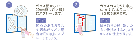 ガラス面から15~20㎝話して「×印」にスプレーします。凹凸のあるガラスや汚れがひどい場合は「×印」にスプレーしましょう。
