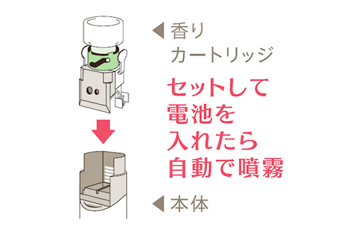 本体に香りカートリッジをセットして、電池を入れるだけ。