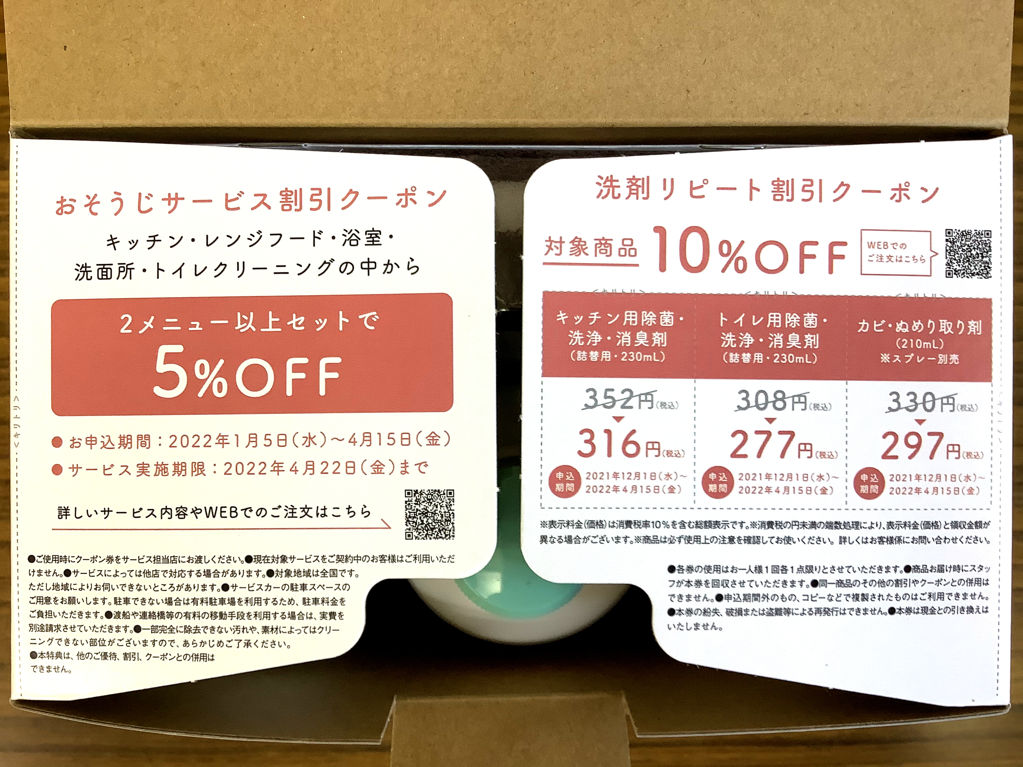 洗剤リピートクーポンは、今回入っている洗剤をリピートでご購入の場合、それぞれ10%OFFでお買い求めいただけます。