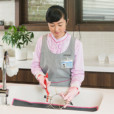より効果的に汚れが落とせるようにおそうじする場所の材質や汚れ具合をプロの目でしっかり確認。専用の道具やクリーナーを使ってていねいに磨き上げます。