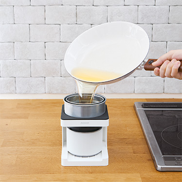 「粉状活性炭」を使ったダスキン独自の高機能フィルターが、調理後の油の揚げカスから出るニオイや汚れをしっかりろ過します。ろ過した後そのまま保存できるのも便利です。