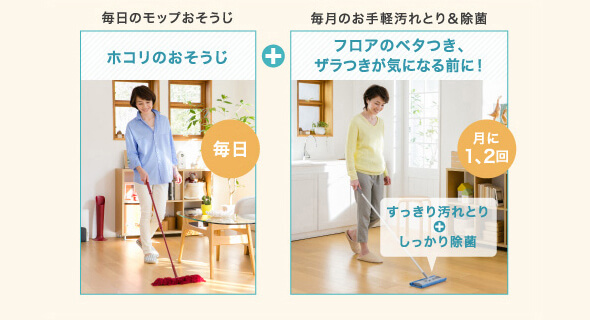 普段はフロアモップでホコリ取りをして、月に1、2回は除菌モップでしっかり除菌。2つのモップを使いこなせば、いつでも清潔&キレイをキープできます。