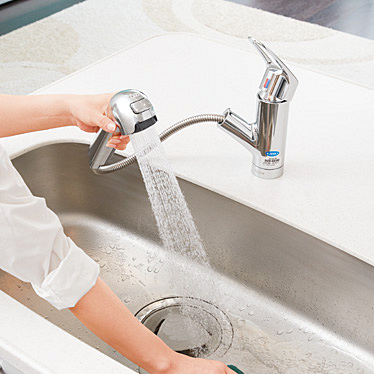 水栓内部に浄水カートリッジを装備しているから、シンクまわりがすっきり広々使えます。