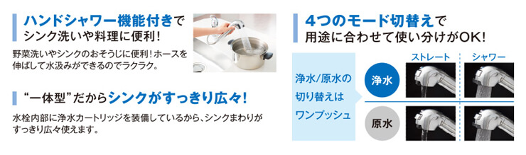 ハンドシャワー機能付きで野菜洗いやシンクのおそうじに便利です。