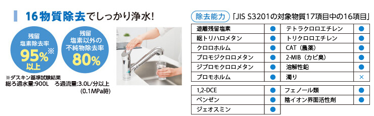 JIS S3201の対象物質17項目中の16項目をしっかり浄水します。