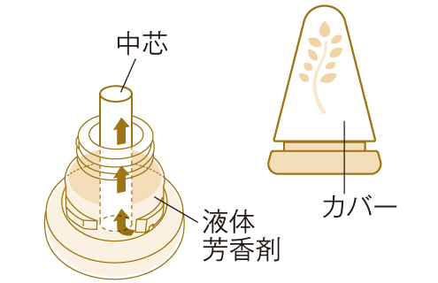 目詰まりの原因となる界面活性剤を使用していないため、最後の一滴まで香りが続きます。また、ダスキンオリジナルの香りの薬剤がゆっくりと揮発するため小さくても香りが持続します。