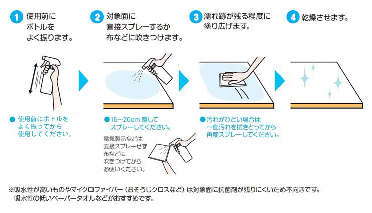 ・電気製品には直接スプレーせず、布などにスプレーしてから拭く。