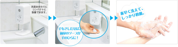 手をさしだせば、適量のソープが手のひらに!素早く洗えて、しっかり殺菌。