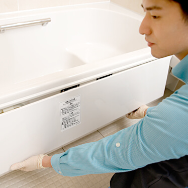 スピーディーかつ確実に洗浄するため、汚れの種類や状態をしっかり確認。浴槽や壁、床など、それぞれの材質に合わせて最適な薬剤と道具を使用します。