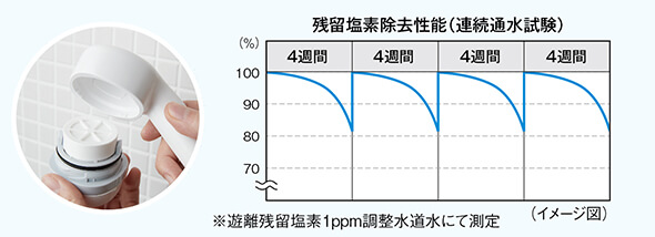4週間毎のカートリッジ交換で塩素除去能力80%以上※を維持します。