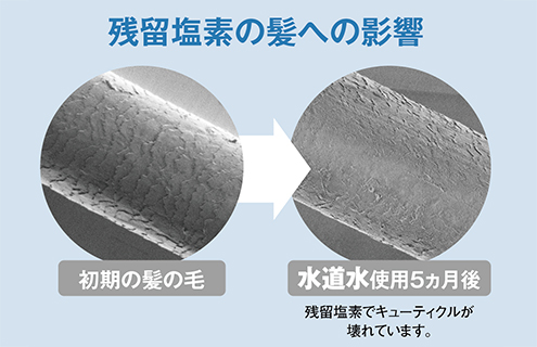 遊離残留塩素濃度1ppmに調整した水道水に5ヵ月の間1日10分間浸し、自然乾燥させた髪を撮影しました(ダスキン調べ)